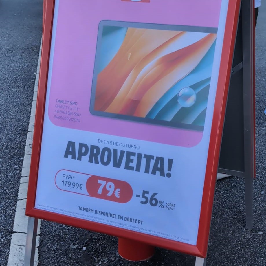 Por exemplo: o Tablet SPC Gravity 5 na imagem da direita custa €129 no site oficial da marca. Ou seja, o PVP de €179,99 parece ter sido inflado pela Darty para o corte no preço parecer maior. A promoção existe, mas o corte de 56% não é real. No agregador de preços KuantoKusta, não existe nenhuma loja a praticar o preço de €179,99 neste tablet... aliás, a maioria dos preços anda nos €99.