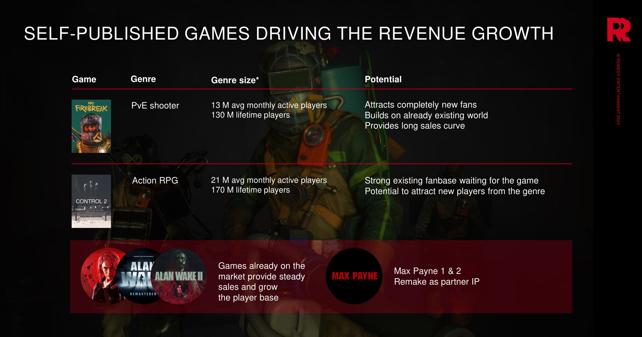 No Capital Markets Day 2024, um dia que a Remedy dedica a fazer uma apresentação aos investidores, um dos slides da apresentação mostra que Control 2 é um RPG de acção.