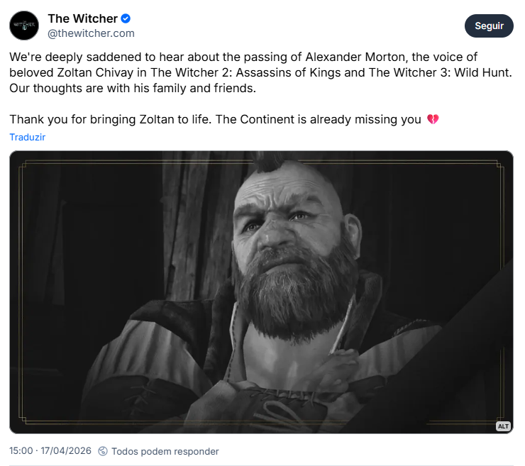 A equipa ligada à franquia lamentou a parda, destacando o impacto que o trabalho de Morton teve na construção da identidade de Zoltan dentro do universo de The Witcher.
